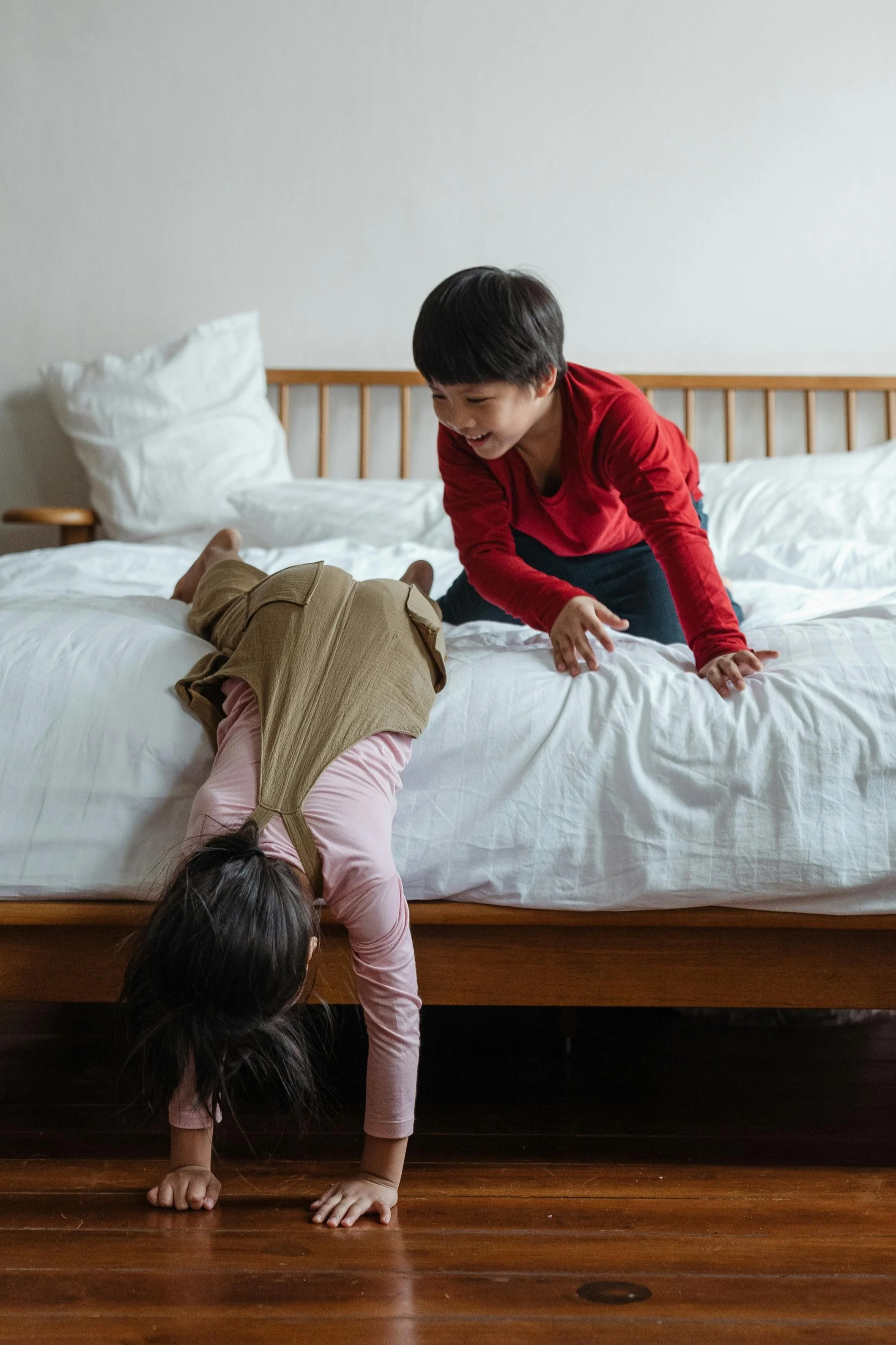 Dos niños jugando en la cama, uno apoyado en las manos y otro en la espalda, en una habitación con suelo de madera y pared blanca.