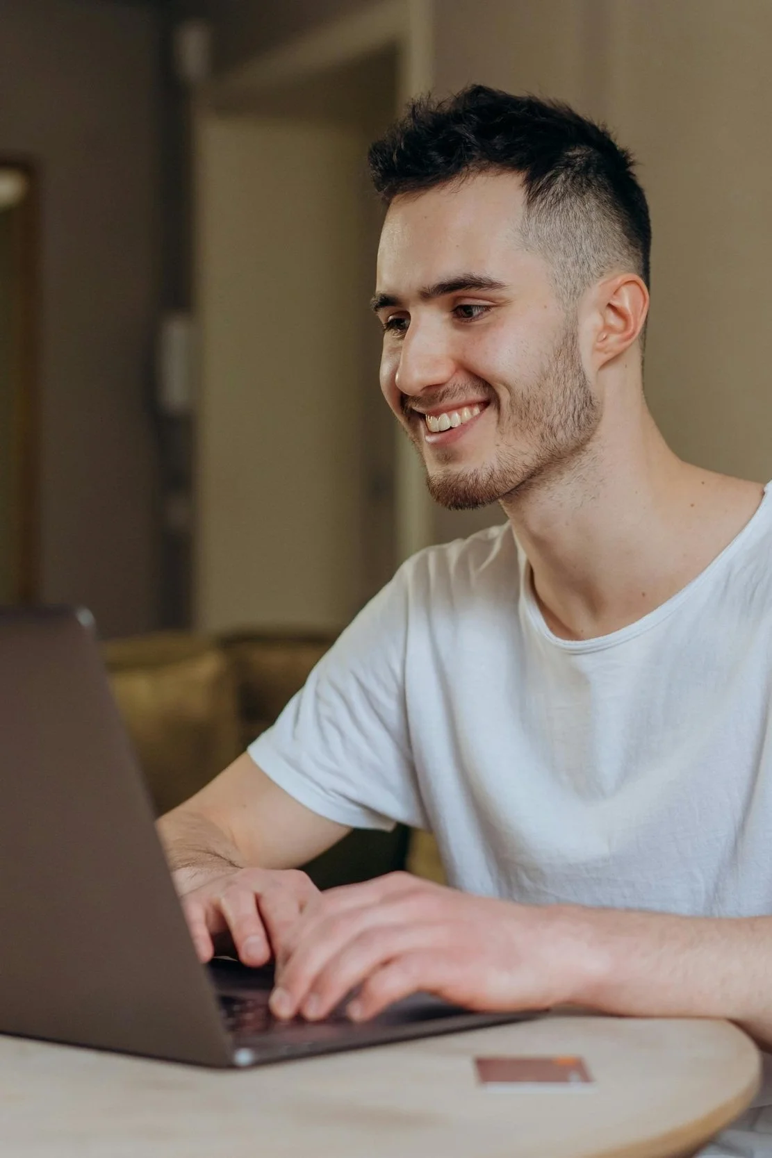 Joven sonriendo y usando una laptop en un ambiente interior.